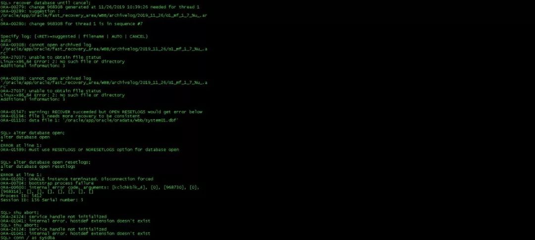 ORA-00279: 更改 25900159 (在 11/26/2019 12:32:54 生成) 对于线程 1 是必需的