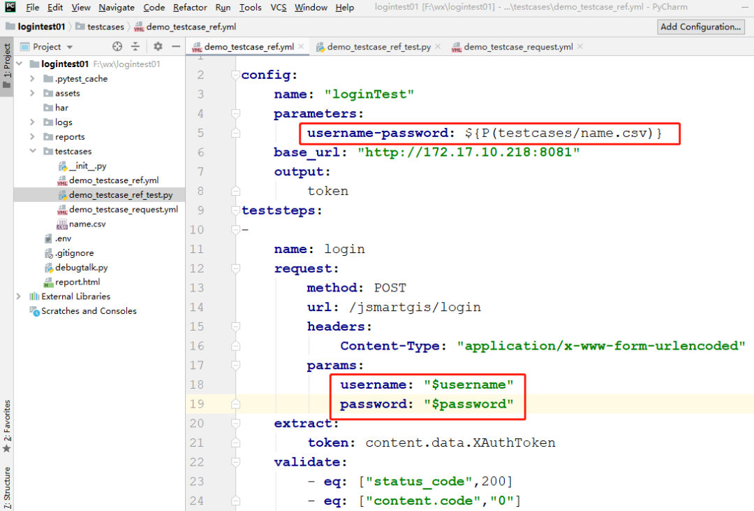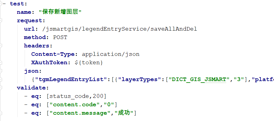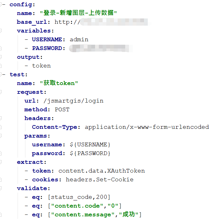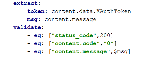 test中包含:name、request(url、method、headers、params或者json)extract(提取token或cookies便于后面的用例调用)、validate(断言)