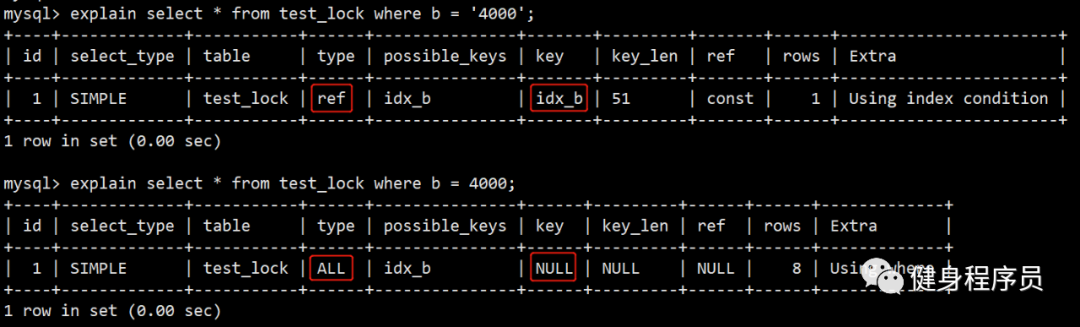 如上图可以看出加了引号用到索引idx_b了,而不加引号就没有用到索引,在更新数据时,会导致InnoDB行锁变表锁。