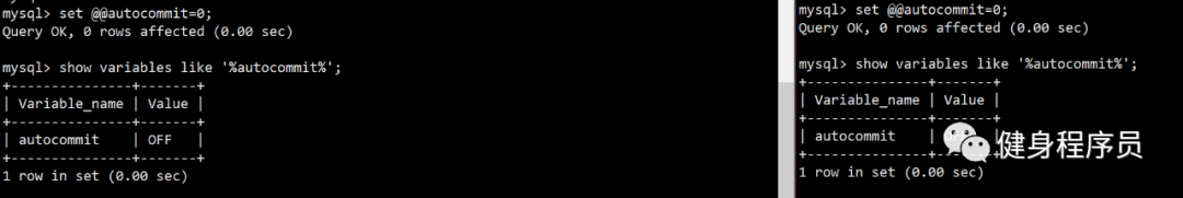 为了演示容易观看,我开了两个客户端,并且设置不自动提交事务。