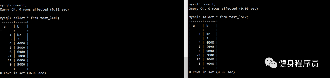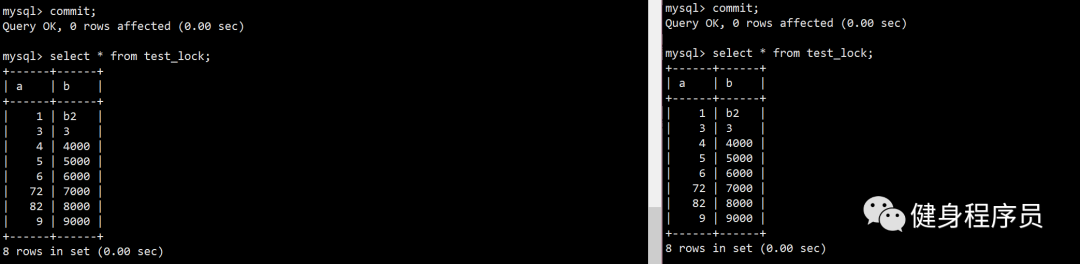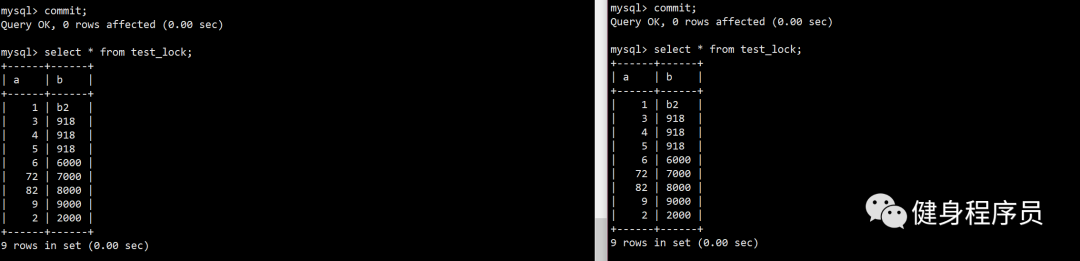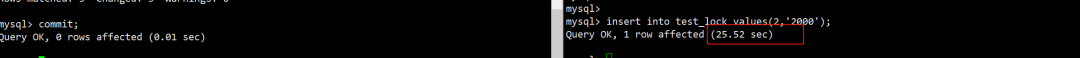 当我左边提交事务后,右边阻塞消失,执行成功。