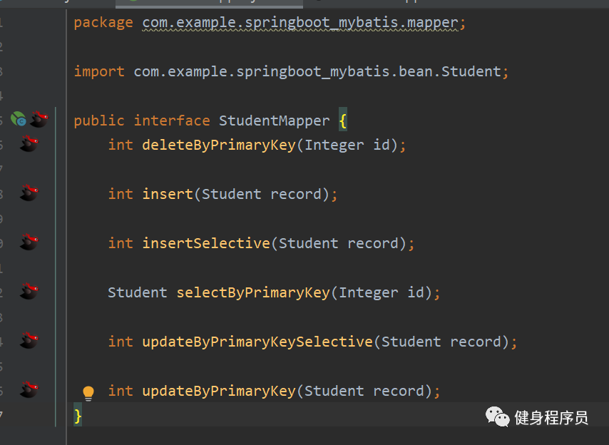 package com.example.springboot_mybatis.mapper;import com.example.springboot_mybatis.bean.Student;public interface StudentMapper {int deleteByPrimaryKey(Integer id);int insert(Student record);int insertSelective(Student record);Student selectByPrimaryKey(Integer id);int updateByPrimaryKeySelective(Student record);int updateByPrimaryKey(Student record);}