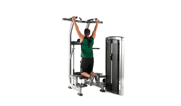 2、向后下方拉动拉动肩膀和上臂,让身体向上,直至杠杆碰到上胸。在进行这部分运动时吐气。提示:达到完全收紧状态后注意力收紧背部肌肉。