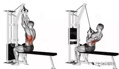 2、吐气的同时将肩膀和上臂向后下方拉动,拉下把手直至碰到上胸。完全收紧时集中注意力收缩背部肌肉。动作中上躯应保持固定,只有手臂运动。前臂只需抓握杠杆,没有其他动作,不要用前臂拉动把手。