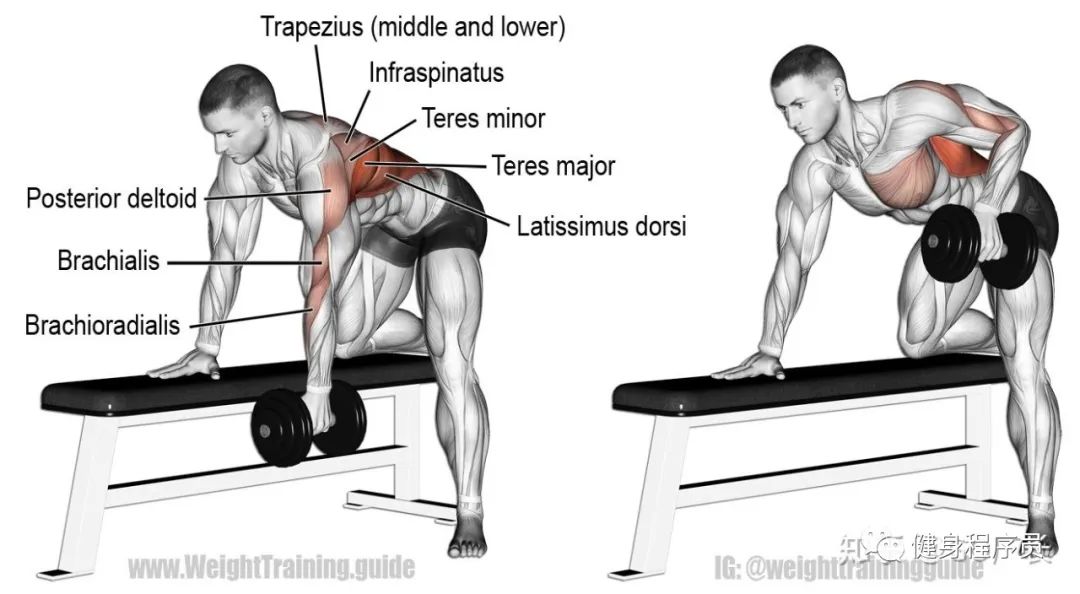 1、前后脚弓步,一条手臂放在哑铃架或者健身椅上支撑身体。另一只手拿哑铃,手臂自然下垂,掌心向内。背部一定要挺直。