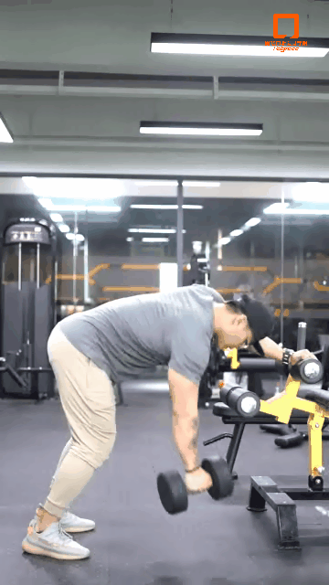 3、在顶端稍适停留,感受背部的肌肉收缩,然后缓缓将哑铃降回起始位置,同时吸气。