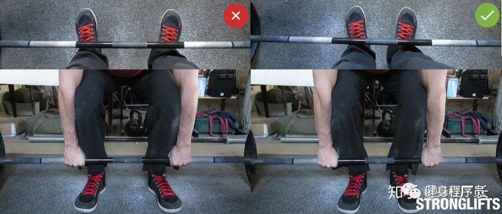 1、如下右图,站的窄一点,不是与肩同宽,防止膝盖内扣!你站的窄了,发现无论多大重量,膝盖即使变形也是外扣,不会发生内扣,而且核心更加容易收紧了。