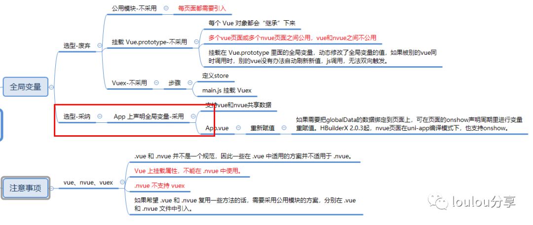 今天主要简单描述下全局变量的设置,在多端框架中,全局变量的设置有很多种,但很多由于其加载、编译以及生效点的不同,会造成全局变量刷新状态异常的问题,造成逻辑判断以及显示非预期的问题。对于下图的理解,我们首先应该考虑uniapp的短板效应,就是图中的注意事项,以及uniapp框架的组成结构,其集成组件的思想、集成方式、组件层次以及生效域。特别是nvue、vuex、vue的作用域。