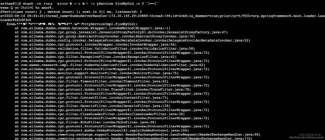 含义: 输出当前方法被调用的调用路径;很多时候我们都知道一个方法被执行,但这个方法被执行的路径非常多,或者你根本就不知道这个方法是从那里被执行了,此时你需要的是 stack 命令;