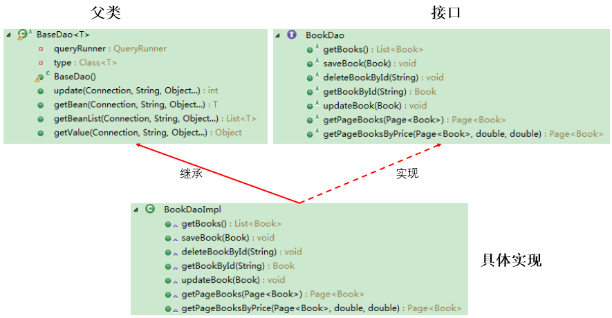 import java.sql.Connection;import java.util.List;import com.atguigu.bookstore.beans.Book;import com.atguigu.bookstore.beans.Page;import com.atguigu.bookstore.dao.BaseDao;import com.atguigu.bookstore.dao.BookDao;public class BookDaoImpl extends BaseDao<Book> implements BookDao {@Overridepublic List<Book> getBooks(Connection conn) {// 调用BaseDao中得到一个List的方法List<Book> beanList = null;// 写sql语句String sql = "select id,title,author,price,sales,stock,img_path imgPath from books";beanList = getBeanList(conn,sql);return beanList;}@Overridepublic void saveBook(Connection conn,Book book) {// 写sql语句String sql = "insert into books(title,author,price,sales,stock,img_path) values(?,?,?,?,?,?)";// 调用BaseDao中通用的增删改的方法update(conn,sql, book.getTitle(), book.getAuthor(), book.getPrice(), book.getSales(), book.getStock(),book.getImgPath());}@Overridepublic void deleteBookById(Connection conn,String bookId) {// 写sql语句String sql = "DELETE FROM books WHERE id = ?";// 调用BaseDao中通用增删改的方法update(conn,sql, bookId);}@Overridepublic Book getBookById(Connection conn,String bookId) {// 调用BaseDao中获取一个对象的方法Book book = null;// 写sql语句String sql = "select id,title,author,price,sales,stock,img_path imgPath from books where id = ?";book = getBean(conn,sql, bookId);return book;}@Overridepublic void updateBook(Connection conn,Book book) {// 写sql语句String sql = "update books set title = ? , author = ? , price = ? , sales = ? , stock = ? where id = ?";// 调用BaseDao中通用的增删改的方法update(conn,sql, book.getTitle(), book.getAuthor(), book.getPrice(), book.getSales(), book.getStock(), book.getId());}}