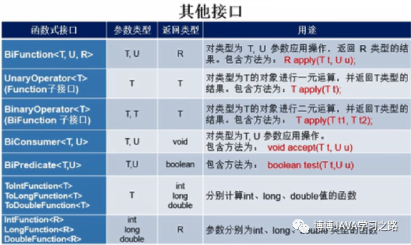 Java内置四大核心函数式接口:消费型接口:传入T类型参数,无返回值,Consumer供给型接口:无传入参数,返回T类型值,Supplier函数型接口:传入T类型参数,返回R类型值,Function断定型接口:传入T类型参数,返回boolean类型值,Predicate