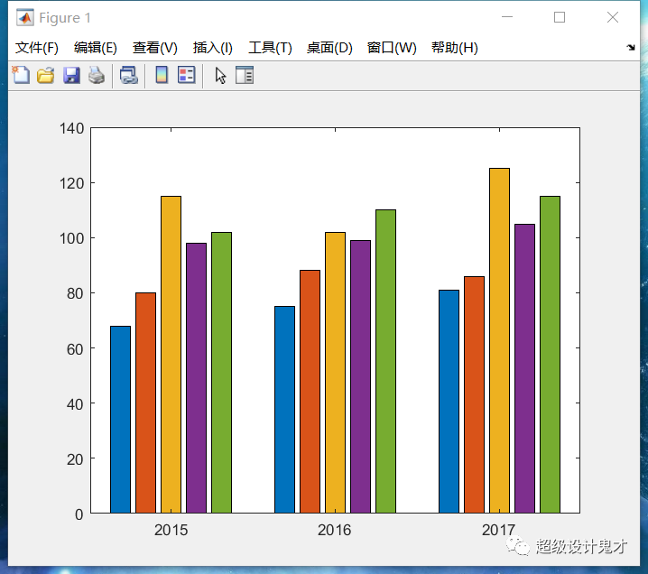x = [2015,2016,2017];y = [68,80,115,98,102;75,88,102,99,110;81,86,125,105,115];bar(x,y,'grouped')