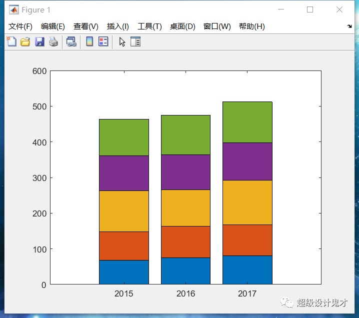 x = [2015,2016,2017];y = [68,80,115,98,102;75,88,102,99,110;81,86,125,105,115];bar(x,y,'stacked')