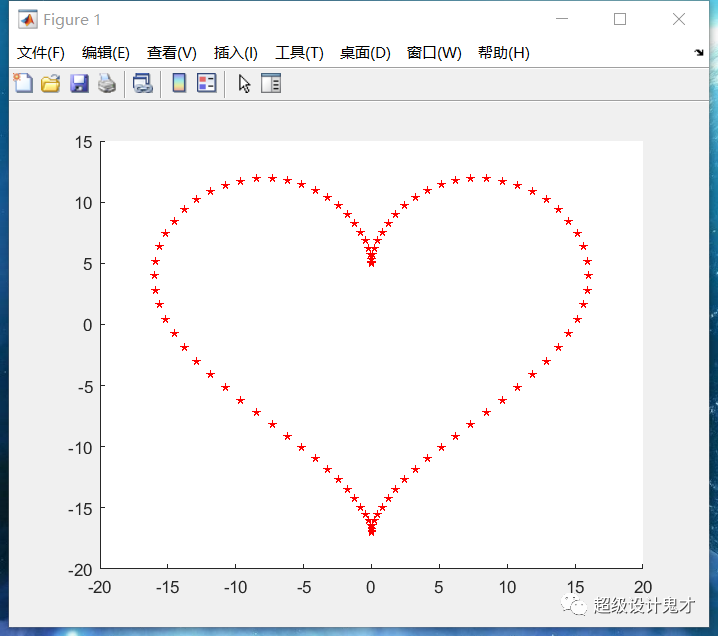 t = 0:pi/50:2*pi;x = 16*sin(t).^3;y = 13*cos(t)-5*cos(2*t)-2*cos(3*t)-cos(4*t);scatter(x,y,'rp','filled')