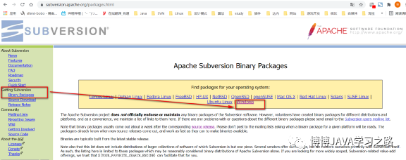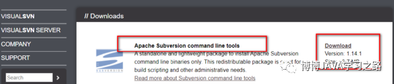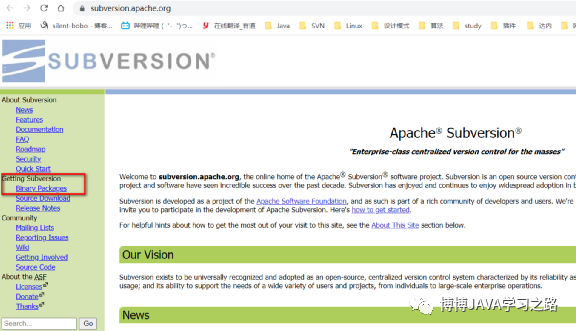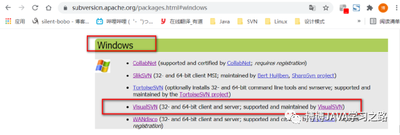 访问官网(https://subversion.apache.org/)点击Binary Packages,选择Windows,跳到Windows项,选择VisualSVN 项目,进入其中,选择Apache Subversion command line tools,即为SVN命令行工具,下载解压即可使用。