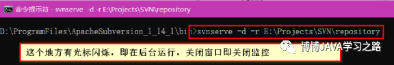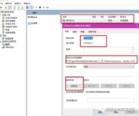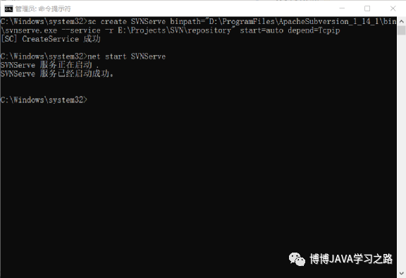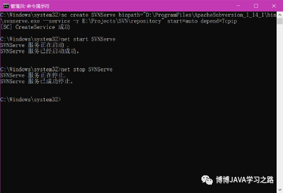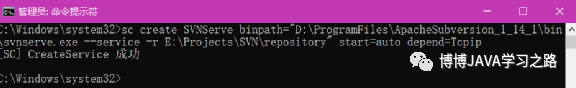 - svnserve -d --listen-port=12340:使用12340端口进行监听- 将svnserve服务添加到windows服务中,使用管理员权限sc create SVNServe binpath="D:\ProgramFiles\ApacheSubversion_1_14_1\bin\svnserve.exe --service -r E:\Projects\SVN\repository" start=auto depend=Tcpip