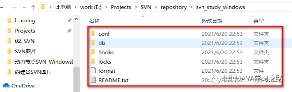 conf - 版本库配置目录db - 版本存储目录hooks - 版本库钩子脚本目录locks - 锁定资源目录format - 版本库版本,正整数readme.txt - 说明文件