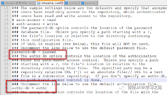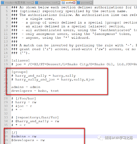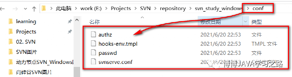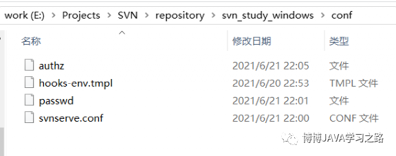 - authz:用户授权文件,负责账户的权限管理,读写权限。- passwd:用户认证文件,用户密码。- svnserve.conf:项目配置文件,开启权限、开启功能。