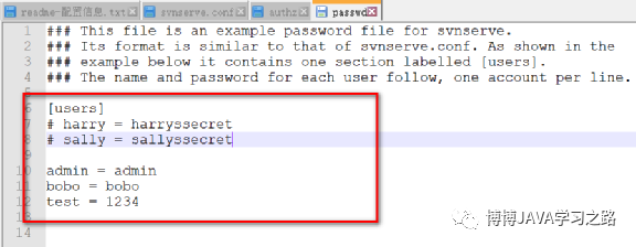 修改passwd文件内容,增加用户和密码,修改如下内容:
