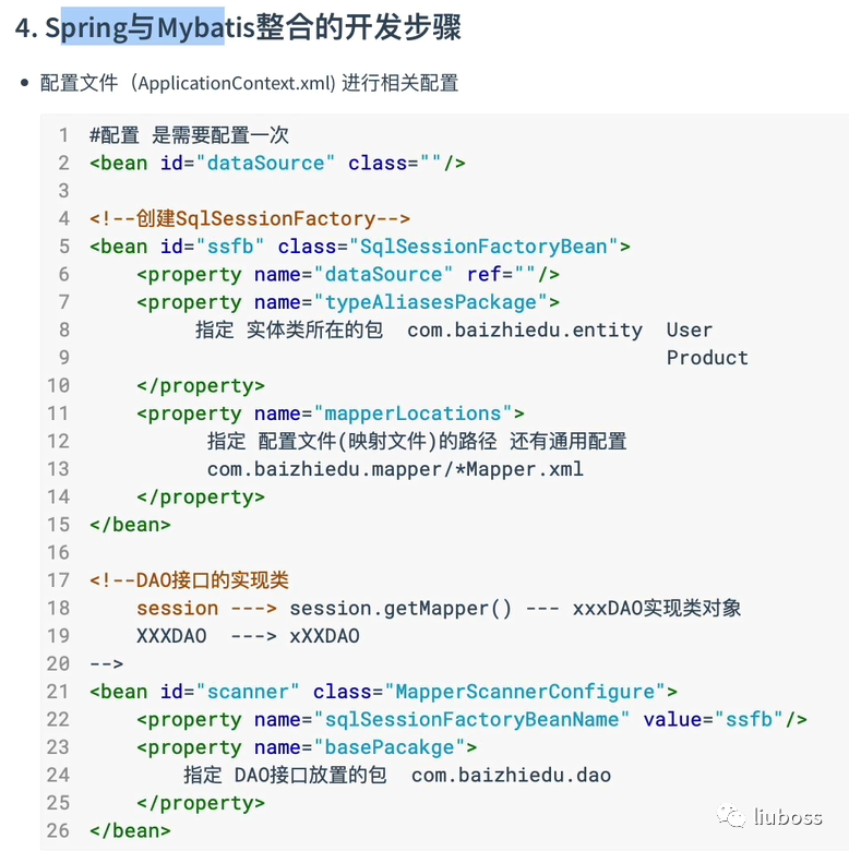 <?xml version="1.0" encoding="UTF-8" ?><!DOCTYPE configurationPUBLIC "-//mybatis.org//DTD Config 3.0//EN""http://mybatis.org/dtd/mybatis-3-config.dtd"><!--mybatis核心配置文件--><configuration><typeAliases><typeAlias type="com.liuboss.demo.User" alias="user"/></typeAliases><environments default="development"><environment id="development"><transactionManager type="JDBC"/><dataSource type="POOLED"><property name="driver" value="com.mysql.jdbc.Driver"/><property name="url"value="jdbc:mysql://localhost:3306/mybatis?useSSL=true&serverTimezone=UTC"/><property name="username" value="root"/><property name="password" value="123456"/></dataSource></environment></environments><mappers><mapper resource="UserMapper.xml"/></mappers></configuration>