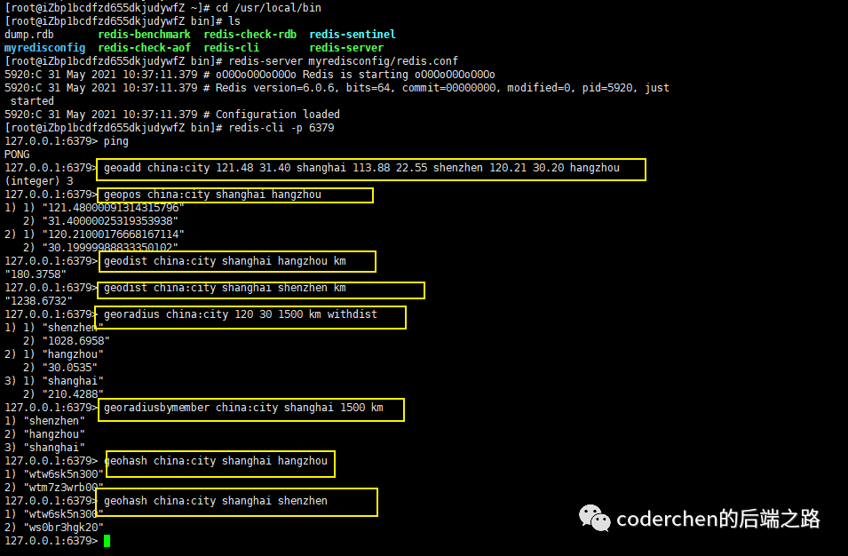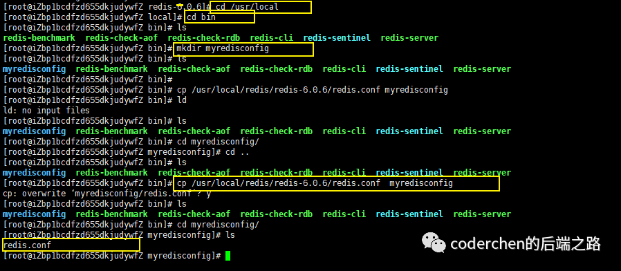 进入/usr/local/bin目录,这是redis的默认安装目录。在这个目录创建一个myredisconfig的文件夹。然后将/usr/local/redis/redis-6.0.6下的redis.conf拷贝到这个文件夹下