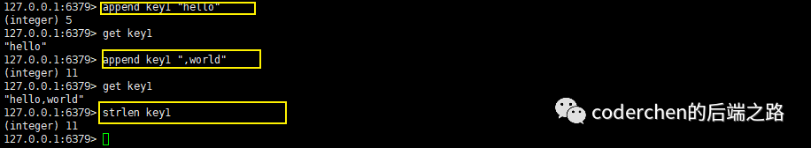 :对不存在的key进行append,等同于set key1 "hello"append key1 ",world"