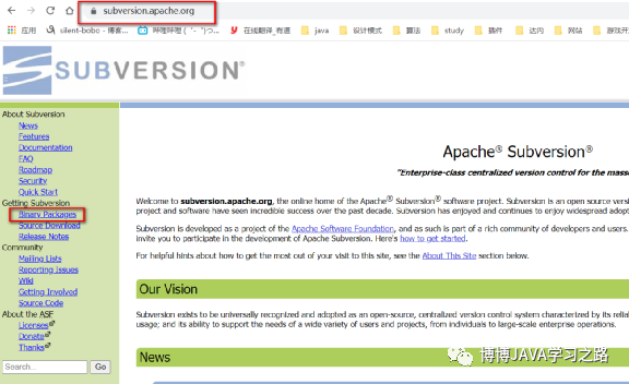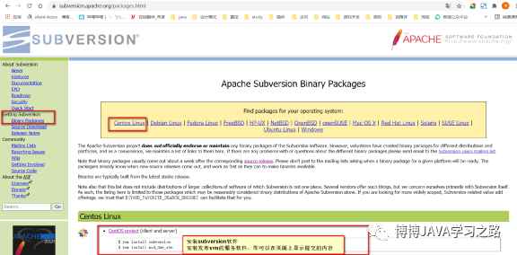 访问Apache Subversion官网:https://subversion.apache.org/下的Getting Subversion/Binary Packages菜单,进入package(包)页面,选择Centos Linux,即可看到安装命令,在Centos系统中执行命令即可