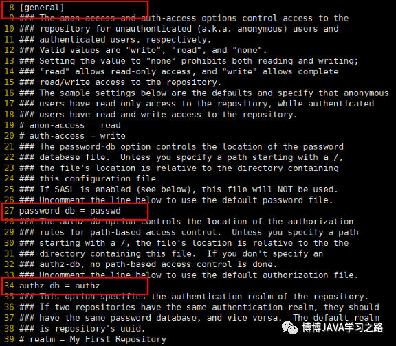 - authz:用户授权文件,负责账户的权限管理,读写权限。- passwd:用户认证文件,用户密码。- svnserve.conf:项目配置文件,开启权限、开启功能。