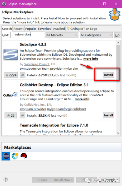 首先打开eclipse软件库,Help -> Eclipse Marketplace,打开后搜索Subversion,选择Subclipse的插件进行安装。