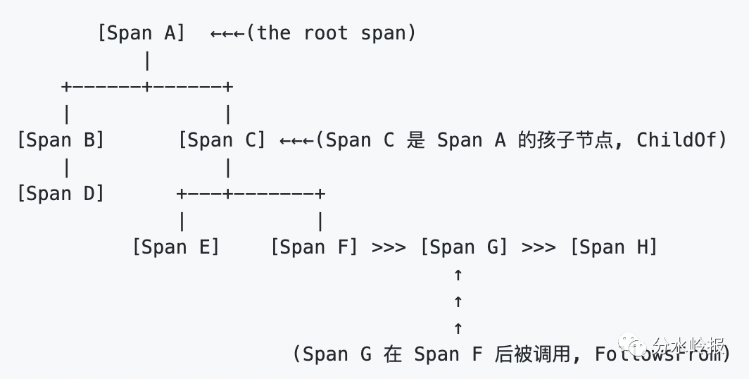 References,Span间关系,目前定义了两种关系:ChildOf(父子,父级span某种程度上取决于子span) 和 FollowsFrom(跟随,父级节点不以任何方式依然他们子节点的执行结果)
