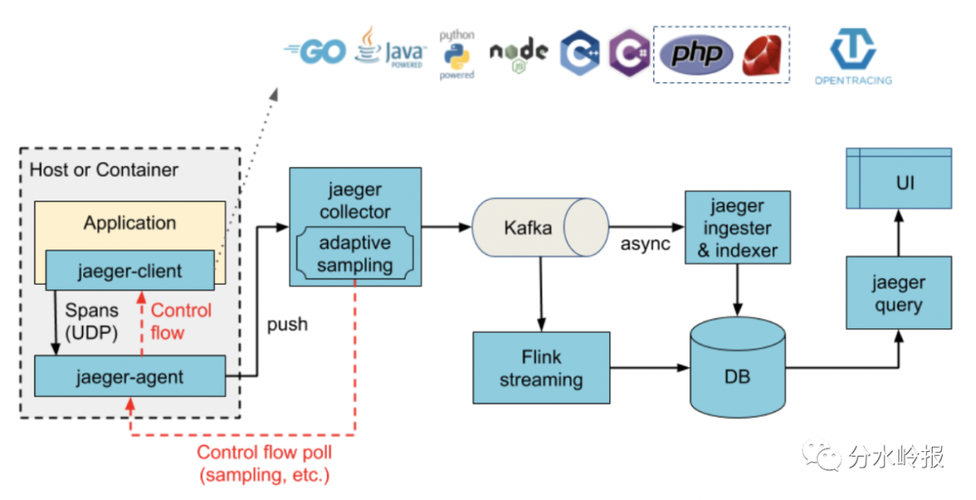 jaeger-client:Jaeger的客户端,实现了OpenTracing的API,支持主流编程语言。客户端直接集成在应用程序中,把trace信息按指定的采样策略传递给jaeger-agent,这个过程通常被称为埋点。