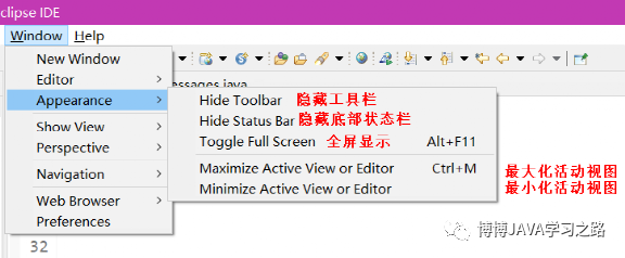 - Minimize active view or editor - 最小化活动视图或编辑器:使活动部分最小化。