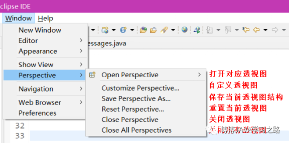 - Previous Perspective - 前一个透视图:在最近使用的透视图列表中激活前一个打开的透视图。