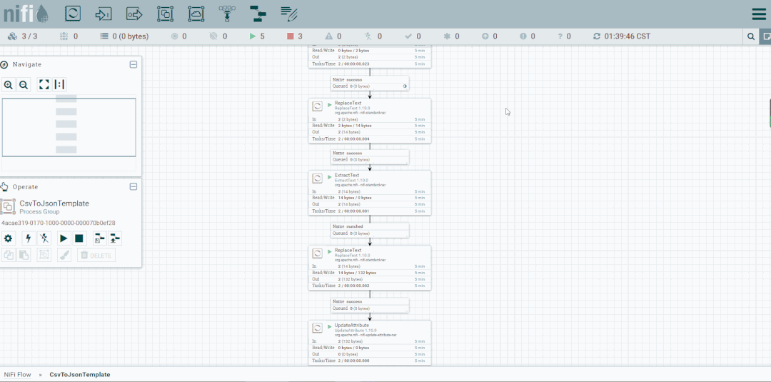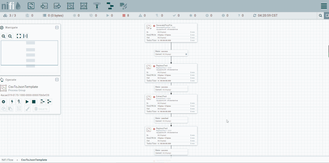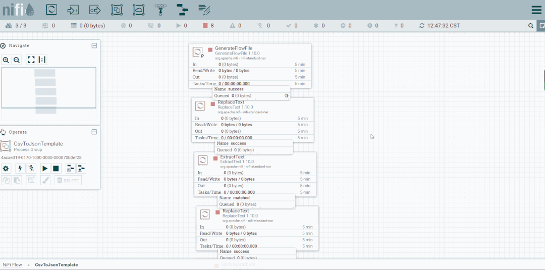 修改第二个处理器:ReplaceText,Replacement Value改为【a,b,c】,这样便不会被下一个ExtractText处理器所捕获。