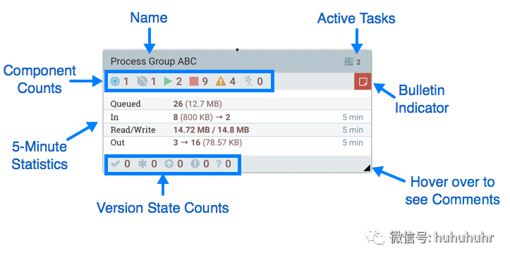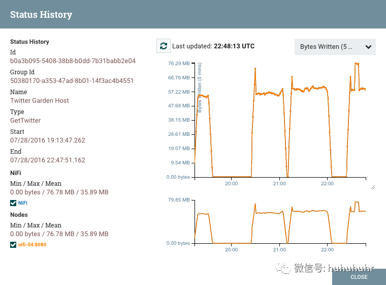 Id:正在显示统计信息的组件的ID。 Group Id:组件所在的进程组的ID。 Name:要显示统计信息的组件的名称。 Component-Specific Entries:显示每种不同类型组件的信息。例如,对于处理器,将显示处理器的类型。对于Connection,将显示源和目标名称和ID。 Start:图表上显示的最早时间。 End:图表上显示的最新时间。 Min/Max/Mean:显示最小值,最大值和平均值(算术平均值或平均值)。如果选择了任何时间范围,这些值仅基于所选时间范围。如果对此NiFi实例进行聚类,则会为整个集群以及每个单独节点显示这些值。在集群环境中,每个节点以不同的颜色显示。这也用作图形的图例,显示图形中显示的每个节点的颜色。将鼠标悬停在集群上或图例中的其中一个节点上也会使相应的节点在图形中变为粗体。