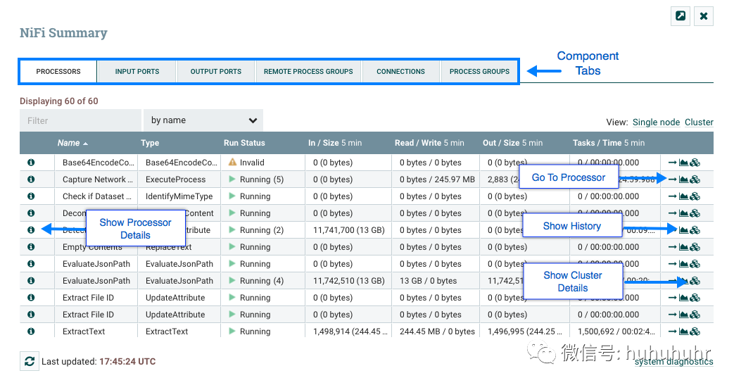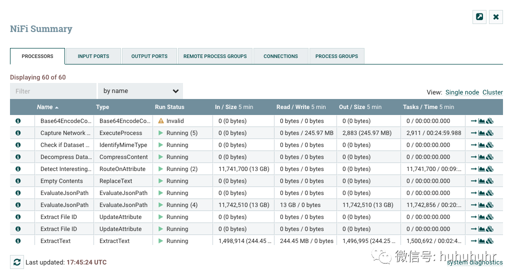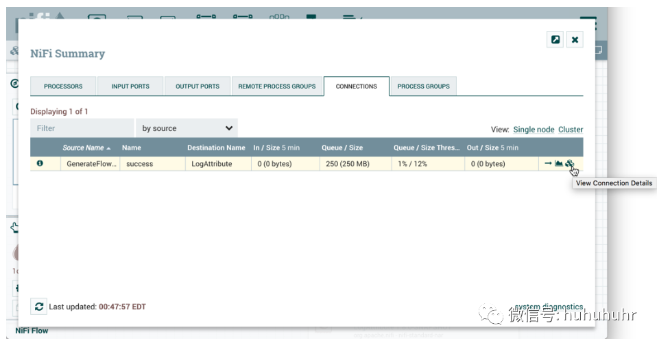 Bulletin Indicator:与整个用户界面中的其他位置一样,当此图标存在时,将鼠标悬停在图标上将提供有关生成的公告的信息,包括消息,严重性级别,公告生成的时间以及(在集群环境中)生成公告的节点。与"摘要"表中的所有列一样,可以通过单击标题对显示公告的列进行排序,以便所有当前存在的公告显示在列表顶部。 Details:单击详细信息图标将为用户提供组件的详细信息。此对话框与用户右键单击组件并选择查看配置菜单项时提供的对话框相同。 Go To:单击此按钮将关闭摘要页面,并将用户直接带到NiFi画布上的组件。这可能会更改用户当前所在的进程组。如果已在新的浏览器选项卡或窗口中打开摘要页面(通过单击"Pop Out"按钮,如下所述),则此图标不可用。 Status History:单击状态历史记录图标将打开一个新对话框,其中显示为此组件呈现的统计信息的历史视图。 Refresh:该Refresh按钮允许用户刷新显示的信息,而无需关闭对话框并再次打开它。上次刷新信息的时间显示在Refresh按钮右侧。页面上的信息不会自动刷新。 Filter:Filter元素允许用户通过键入全部或部分条件(例如处理器类型或处理器名称)来过滤摘要表的内容。可用的过滤器类型根据所选选项卡而不同。例如,如果查看处理器选项卡,则用户可以按名称或类型进行过滤。查看连接选项卡时,用户可以按源,名称或目标名称进行筛选。更改文本框的内容时,将自动应用过滤器。文本框下方是表中表中有多少条目与过滤器匹配以及表中存在多少条目的指示符。 Pop-Out:监视流时,能够在单独的浏览器选项卡或窗口中打开摘要表是有帮助的。按钮旁边的Pop-Out按钮Close将导致在新的浏览器选项卡或窗口中打开整个摘要对话框(具体取决于浏览器的配置)。页面弹出后,对话框将在原始浏览器选项卡/窗口中关闭。在新选项卡/窗口中,"Pop-Out"按钮和"Go To"按钮将不再可用。 System Diagnostics:系统诊断窗口提供有关系统在系统资源利用率方面的执行情况的信息。虽然这主要适用于管理员,但在此视图中提供了它,因为它确实提供了系统摘要。此对话框显示CPU利用率,磁盘空闲程度以及特定于Java的度量标准(如内存大小和利用率)以及垃圾收集信息等信息。
