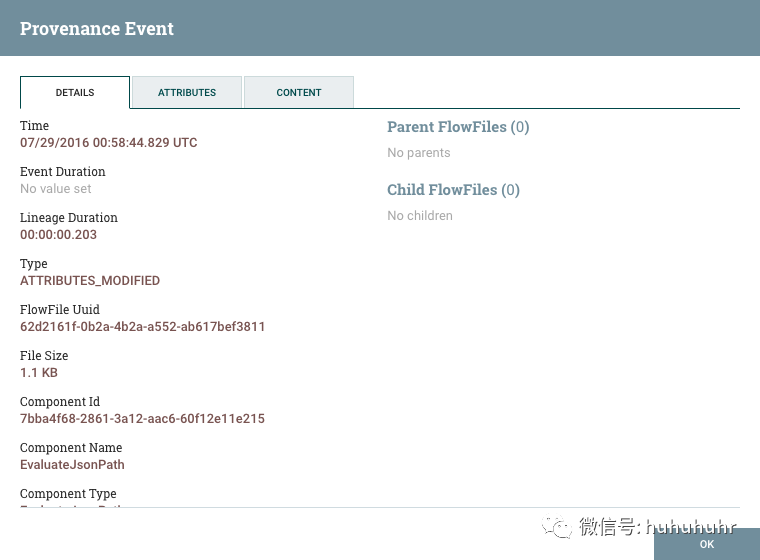 详细信息选项卡显示有关事件的各种详细信息,例如事件发生的时间,事件的类型以及生成事件的组件。显示的信息将根据事件类型而有所不同。此选项卡还显示有关已处理的FlowFile的信息。除了显示在详细信息选项卡左侧的FlowFile的UUID之外,与详细信息选项卡右侧显示的与该FlowFile相关的任何父文件或子级FlowFile的UUID也显示在该详细信息选项卡的右侧。