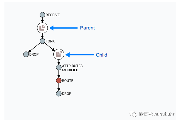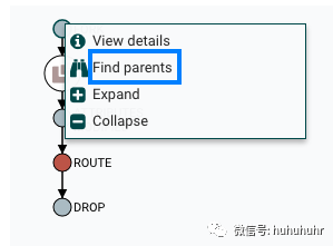 有时,用户可能需要跟踪从中生成另一个FlowFile的原始FlowFile。例如,当发生FORK或CLONE事件时,NiFi会跟踪生成其他FlowFiles的父FlowFile,并且可以在Lineage中找到父FlowFile。右键单击沿袭图中的事件,然后从上下文菜单中选择"查找父项"。