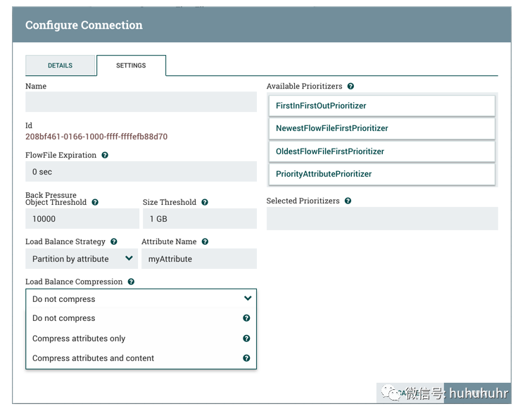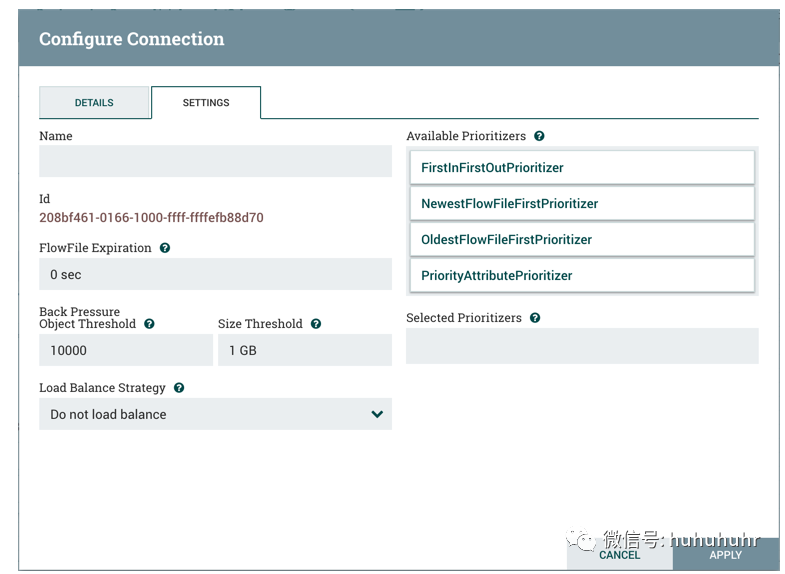 设置选项卡提供配置连接名称,FlowFile到期,背压阈值,负载平衡策略和优先级的功能:
