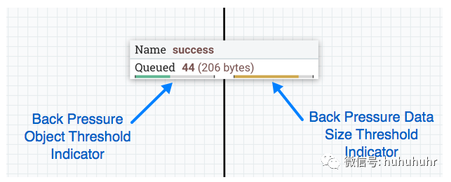 启用背压时,连接标签上会出现小进度条,因此在查看画布上的流时,DFM可以一目了然地看到它。进度条根据队列百分比更改颜色:绿色(0-60%),黄色(61-85%)和红色(86-100%)。