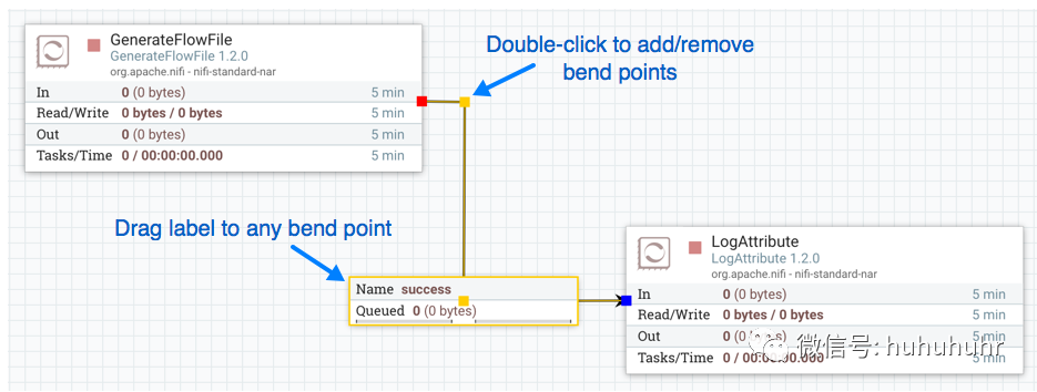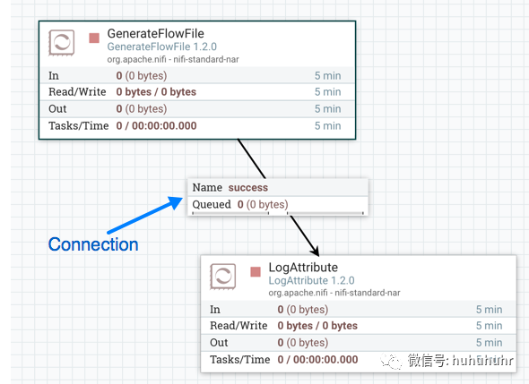 将处理器和其他组件添加到画布并进行配置后,下一步是将它们彼此连接,以便让NiFi知道在处理完每个FlowFile后如何传输数据。这是通过在每个组件之间创建连接来实现的。当用户将鼠标悬停在组件的中心上时,会出现一个新的连接图标