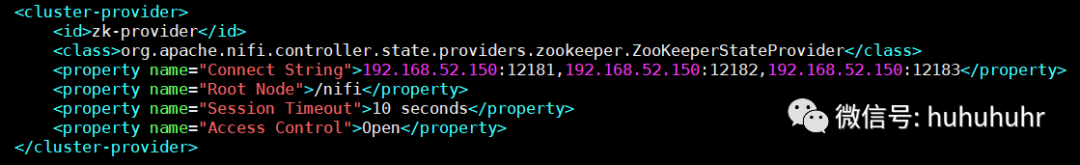 <cluster-provider><id>zk-provider</id><class>org.apache.nifi.controller.state.providers.zookeeper.ZooKeeperStateProvider</class><property name="Connect String">192.168.52.150:12181,192.168.52.150:12182,192.168.52.150:12183</property><property name="Root Node">/nifi</property><property name="Session Timeout">10 seconds</property><property name="Access Control">Open</property></cluster-provider>