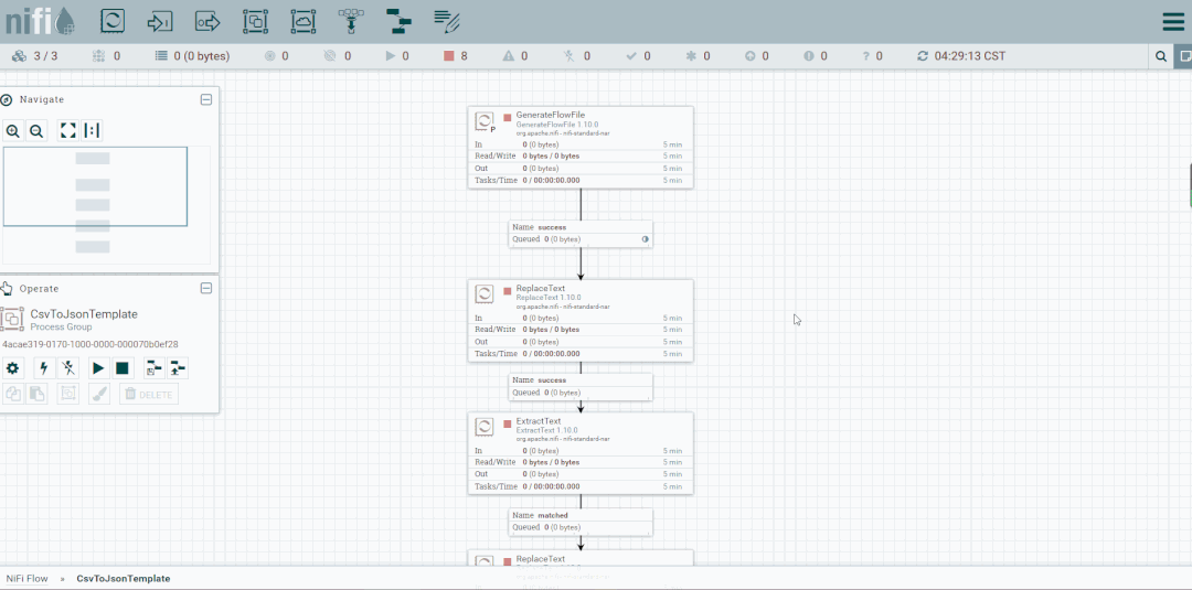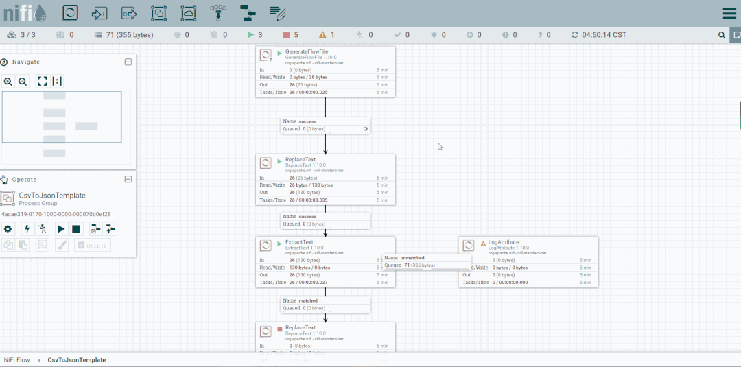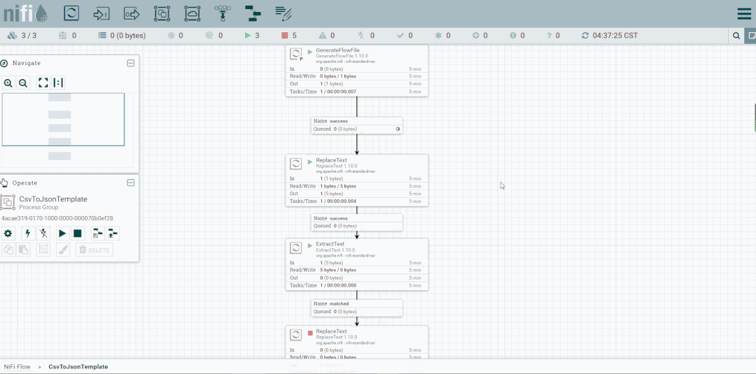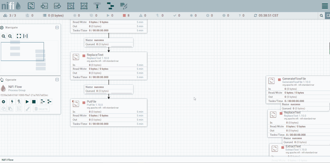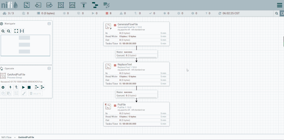 处理器名称:这是处理器的用户定义名称。默认情况下,Processor的名称与Processor Type相同。在示例中,此值为"Copy to review"。 活动任务:此处理器当前正在执行的任务数。此数字受处理器配置对话框的计划选项卡中的并发任务设置的约束。在这里,我们可以看到处理器当前正在执行一项任务。如果NiFi实例是集群的,则此值表示当前正在集群中的所有节点上执行的任务数。 5分钟统计:处理器以表格形式显示几种不同的统计数据。这些统计数据中的每一个都代表过去五分钟内完成的工作量。如果NiFi实例是集群的,则这些值表示在过去五分钟内所有节点组合完成了多少工作。这些指标是: In:处理器从其传入Connections的队列中提取的数据量。此值表示为count size,其中count是从队列中提取的FlowFiles的数量,size是这些FlowFiles内容的总大小。在此示例中,处理器已从输入队列中提取了29个FlowFiles,总计14.16兆字节(MB)。 Read/Write:处理器从磁盘读取并写入磁盘的FlowFile内容的总大小。这提供了有关此处理器所需的I/O性能的有用信息。某些处理器可能只读取数据而不写入任何内容,而某些处理器不会读取数据但只会写入数据。其他可能既不会读取也不会写入数据,而某些处理器会读取和写入数据。在这个例子中,我们看到在过去的五分钟内,这个处理器读取了4.88 MB的FlowFile内容,并且写了4.88 MB。这是我们所期望的,因为这个处理器只是将FlowFile的内容复制到磁盘。但请注意,这与从输入队列中提取的数据量不同。这是因为它从输入队列中提取的某些文件已经存在于输出目录中,并且处理器配置为在发生这种情况时将FlowFiles路由到失败。因此,对于那些已经存在于输出目录中的文件,数据既不会被读取也不会被写入磁盘。 Out:处理器已传输到其出站连接的数据量。这不包括处理器自行删除的FlowFiles,也不包括路由到自动终止的连接的FlowFiles。与上面的"In"指标一样,此值表示为count size,其中count是已转移到出站Connections的FlowFiles的数量,size是这些FlowFiles内容的总大小。在此示例中,所有关系都配置为自动终止,因此不会报告任何FlowFiles已被转出。 Tasks/Time:此处理器在过去5分钟内被触发运行的次数,以及执行这些任务所花费的时间。时间格式为hour:minute:second。请注意,所花费的时间可能超过五分钟,因为许多任务可以并行执行。例如,如果处理器计划运行60个并发任务,并且每个任务都需要一秒钟才能完成,则所有60个任务可能会在一秒钟内完成。但是,在这种情况下,我们会看到时间指标显示它需要60秒,而不是1秒。或换句话说,这个时间可以被认为是"系统时间"。