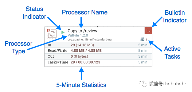 处理器类型:NiFi提供多种不同类型的处理器,以便执行各种任务。每种类型的处理器都旨在执行一项特定任务。处理器类型(在此示例中为PutFile)描述了此处理器执行的任务。在这种情况下,处理器将FlowFile写入磁盘 - 或者将FlowFile放入文件。 公告指示器:当处理器记录某个事件已发生时,它会生成一个公告,以通过用户界面通知正在监控NiFi的人员。DFM能够通过更新处理器配置对话框的设置选项卡中的公告级别字段来配置应在用户界面中显示的公告。默认值为WARN,这意味着UI中仅显示警告和错误。除非此处理器存在公告,否则此图标不存在。当它出现时,用鼠标悬停在图标上将提供一个工具提示,说明处理器和公告级别提供的消息。如果NiFi的实例是集群的,它还将显示发布公告的节点。 状态指示灯:显示处理器的当前状态。以下指标是可能的: 正在运行:处理器当前正在运行。