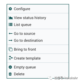 Configure:此选项允许用户更改连接的配置。 View status history:此选项打开连接统计信息随时间的图形表示。 List queue:此选项列出可能正在等待处理的FlowFiles队列。 Go to source:如果画布上连接的源组件和目标组件之间有很长的距离,则此选项很有用。通过单击此选项,画布视图将跳转到连接源。 Go to destination:与"转到源"选项类似,此选项将视图更改为画布上的目标组件,如果两个连接的组件之间存在较长距离,则此选项可能很有用。 Bring to front:如果其他东西(例如另一个连接)与其重叠,则此选项将连接带到画布的前面。 Empty queue:此选项允许DFM清除可能正在等待处理的FlowFiles队列。当DFM不关心从队列中删除数据时,此选项在测试期间特别有用。选择此选项后,用户必须确认是否要删除队列中的数据。 Delete:此选项允许DFM删除两个组件之间的连接。请注意,必须先停止连接两侧的组件,并且连接必须为空才能删除。