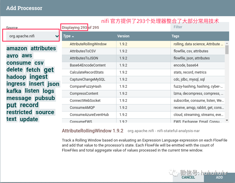 Processor:处理器,是NiFi组件,负责创建,发送,接收,转换,路由,拆分,合并和处理FlowFiles。它是NiFi用户可用于构建其数据流的最重要的构建块。