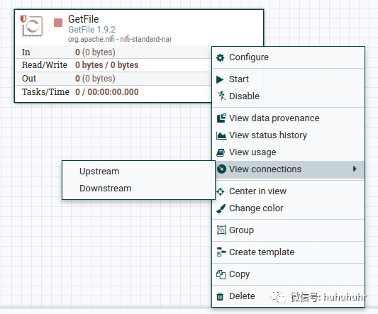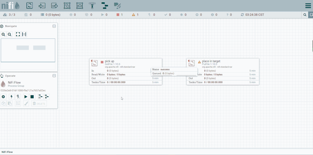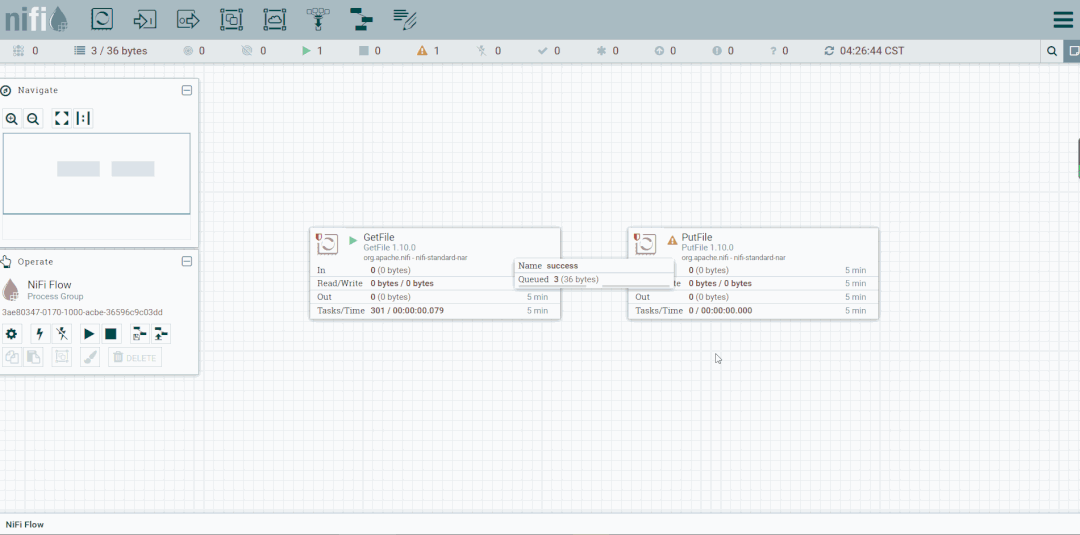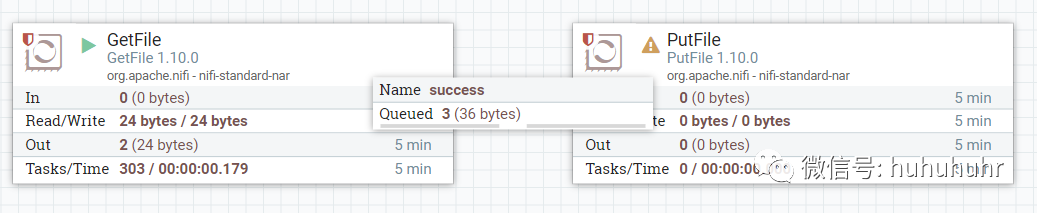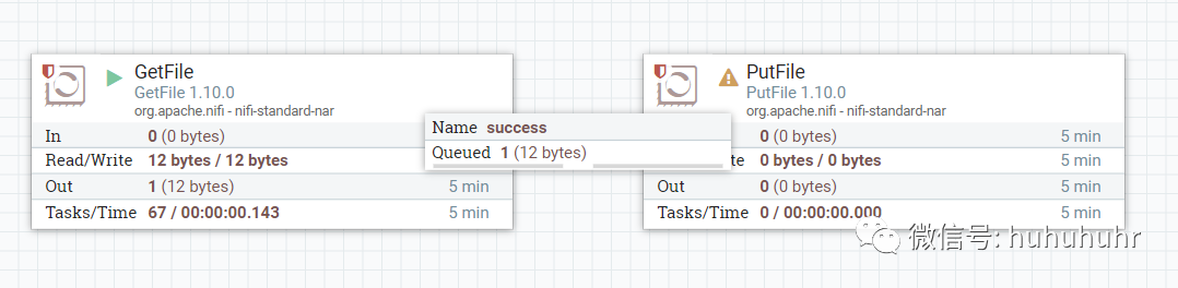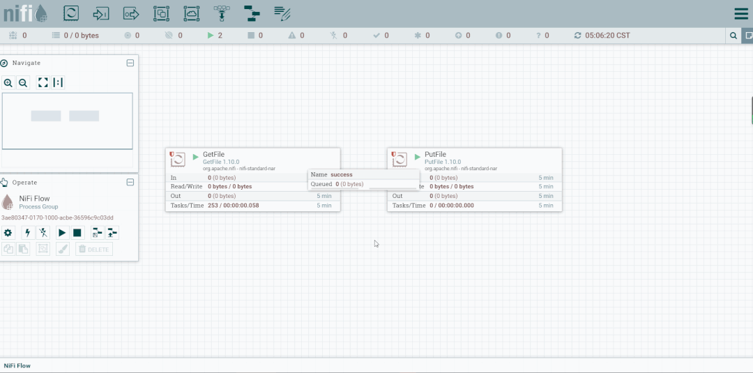 画布上的每个处理器,进程组(Group)和远程进程组都提供了有关组件处理了多少数据的若干统计信息。这些统计信息提供有关在过去五分钟内处理了多少数据的信息。这是一个滚动窗口,允许我们查看处理器消耗的FlowFiles数量,以及处理器发出的FlowFiles数量。