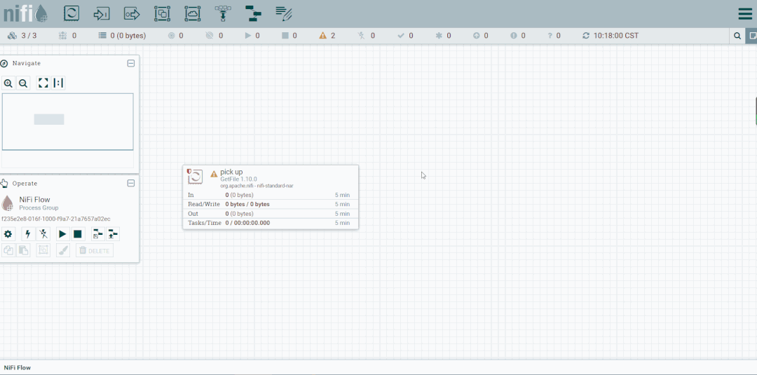 如果NiFi实例位于群集中,我们还会在此处看到一个指示器,告诉我们群集中有多少节点以及当前连接的节点数。在这种情况下,活动线程的数量和队列大小指示当前连接的所有节点的所有总和。