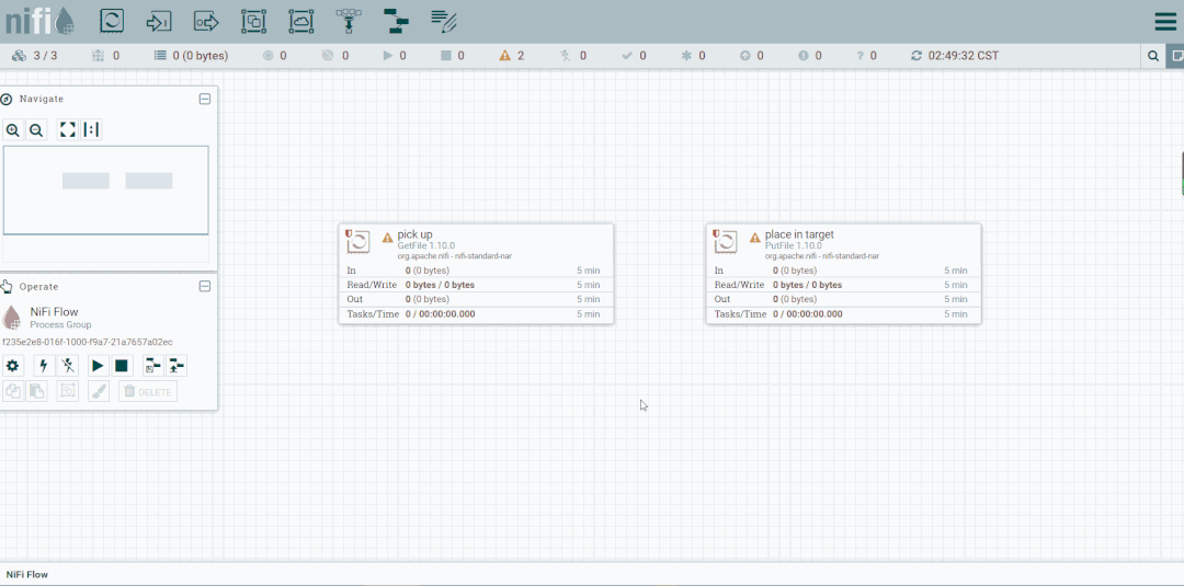 在组件工具栏下的NiFi屏幕顶部附近有一个条形,称为状态栏。它包含一些关于NiFi当前健康状况的重要统计数据。活动线程的数量可以指示NiFi当前的工作状态,排队统计数据表示当前在整个流程中排队的FlowFile数量以及这些FlowFiles的总大小。
