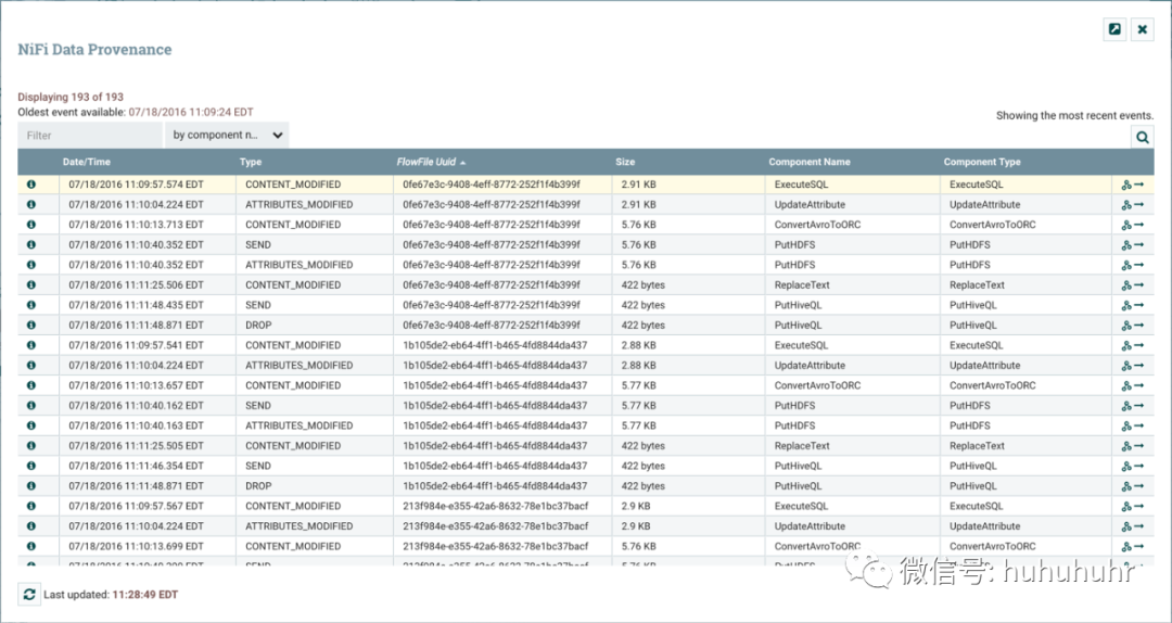 在这里,我们可以确切地看到该事件发生的时间,事件影响的FlowFile,事件执行的组件(处理器等),事件花费的时间以及事件发生时NiFi数据的总体时间(总潜伏期)。